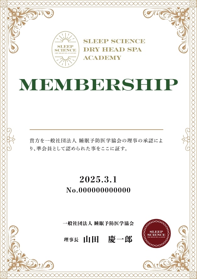 ドライヘッドマッサージ受講の卒業生は『一般社団法人 睡眠予防医学協会』の準会員として入会(任意)する事ができます。